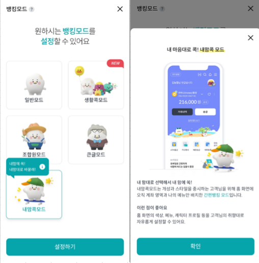 내맘콕모드는 사용자가 홈 화면의 색상, 메뉴, 캐릭터 등을 자유롭게 설정할 수 있는 모드입니다. 사용자는 자신의 취향에 맞게 홈 화면을 꾸밀 수 있으며, 자주 사용하는 메뉴를 전면에 배치하여 더욱 편리하게 이용할 수 있습니다.