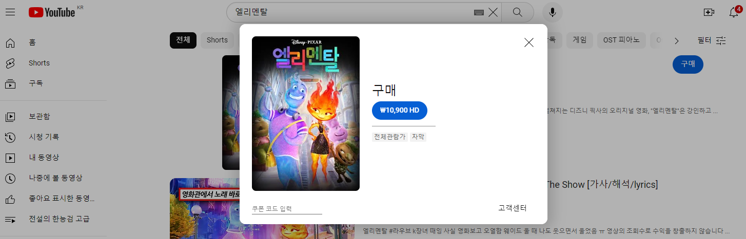 유튜브에서 10,900원에 영화 엘리멘탈 시청이 가능합니다.