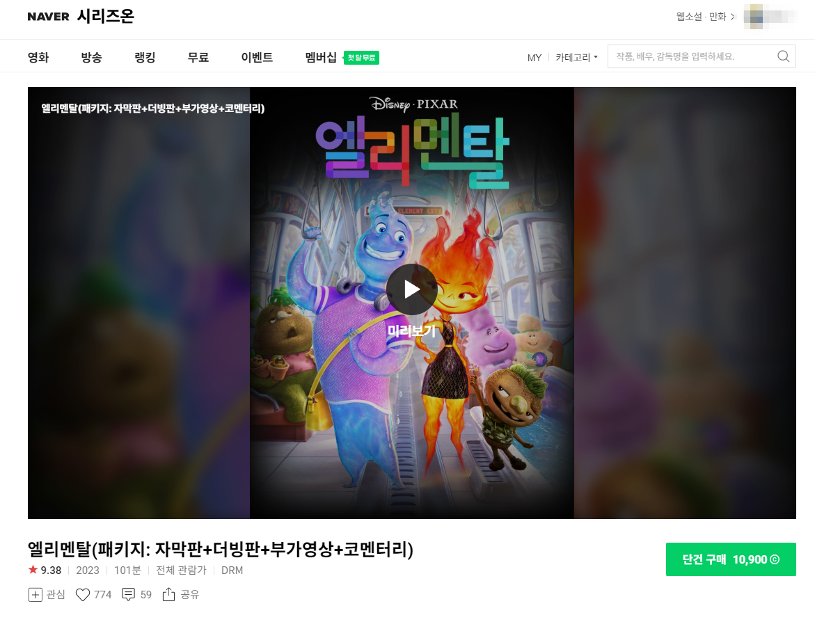 네이버시리즈온에서 10,900원에 영화 엘리멘탈 시청이 가능합니다.