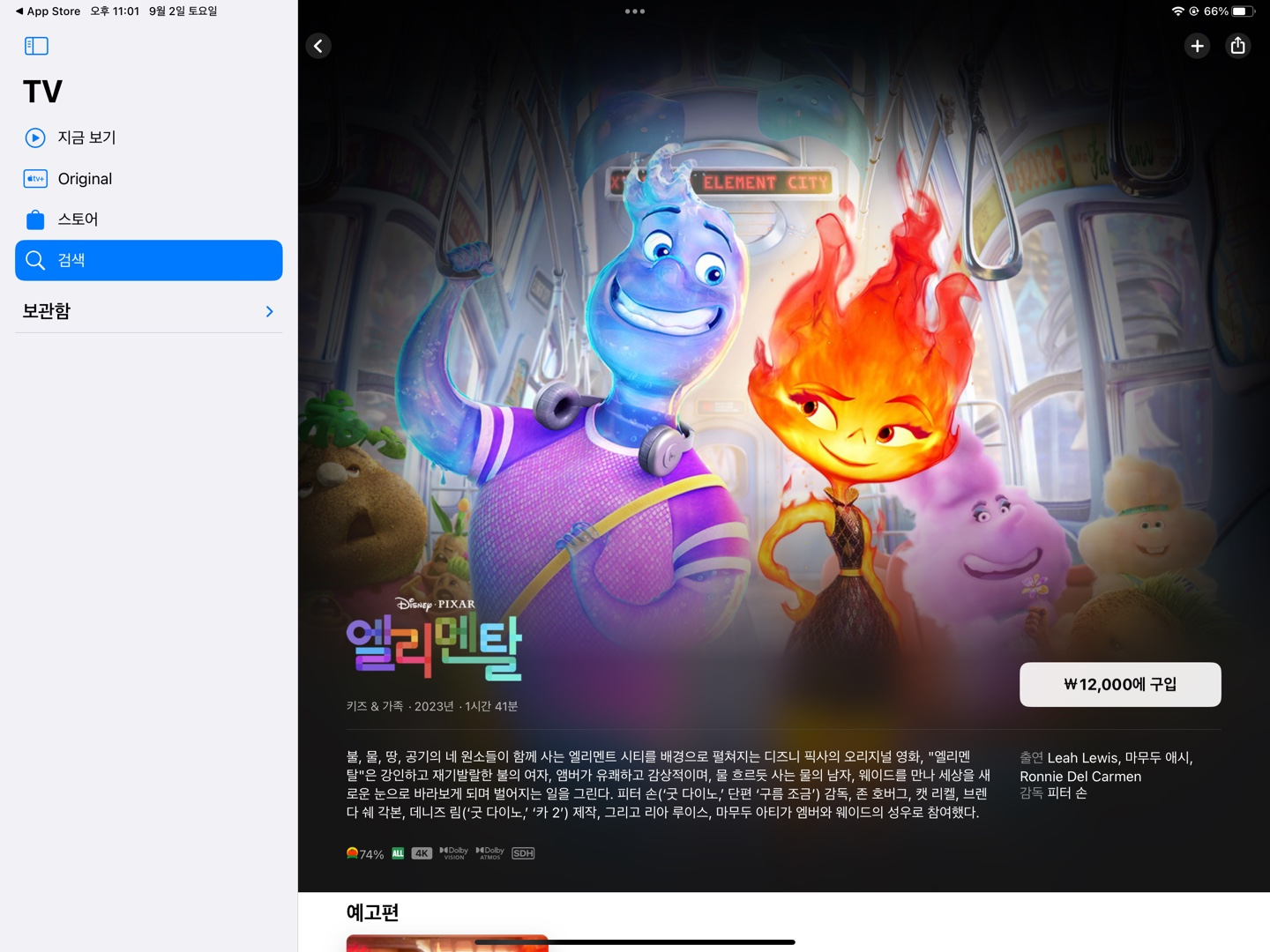 애플tv에서 12,000원에 영화 엘리멘탈 시청이 가능합니다.
