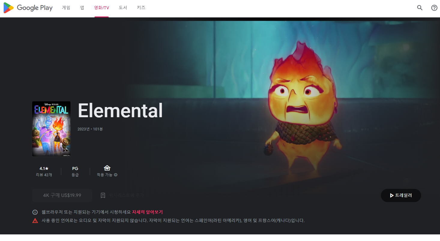 구글플레이영화에서 19.99달러에 영화 엘리멘탈 시청이 가능합니다. 19.99달러는 현재환율로 26,416원 입니다. 구글플레이는 잘 활용하지 않아서 이게 맞는건가 싶네요..