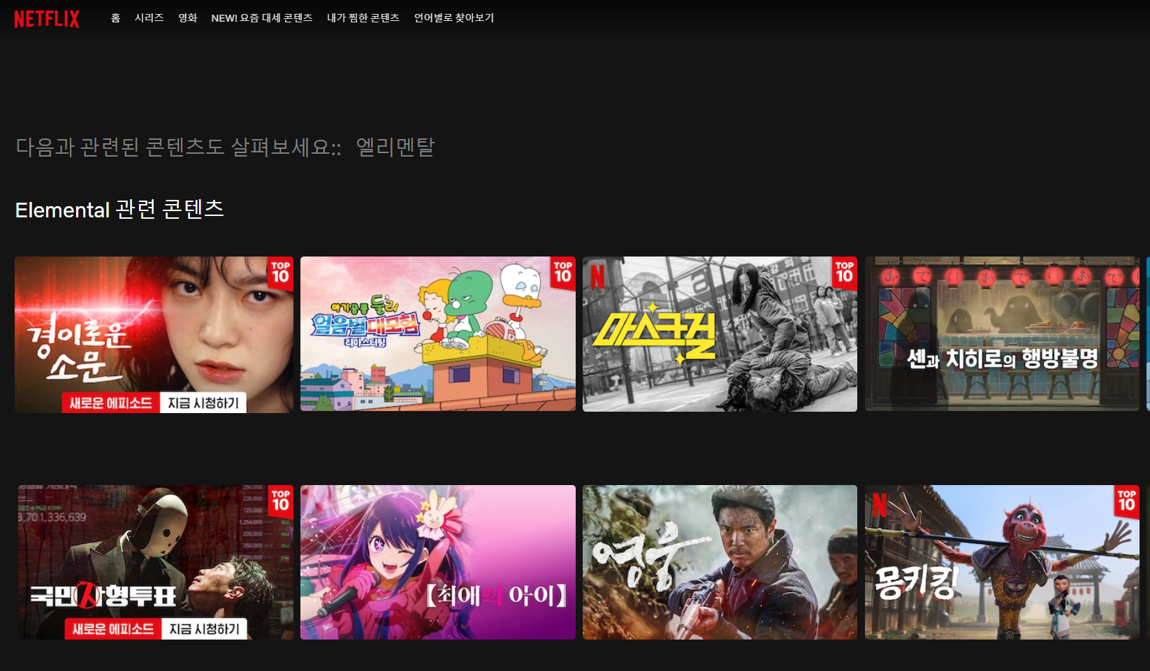 넷플릭스에서는 엘리멘탈을 검색하면 관련콘텐츠가 없습니다.