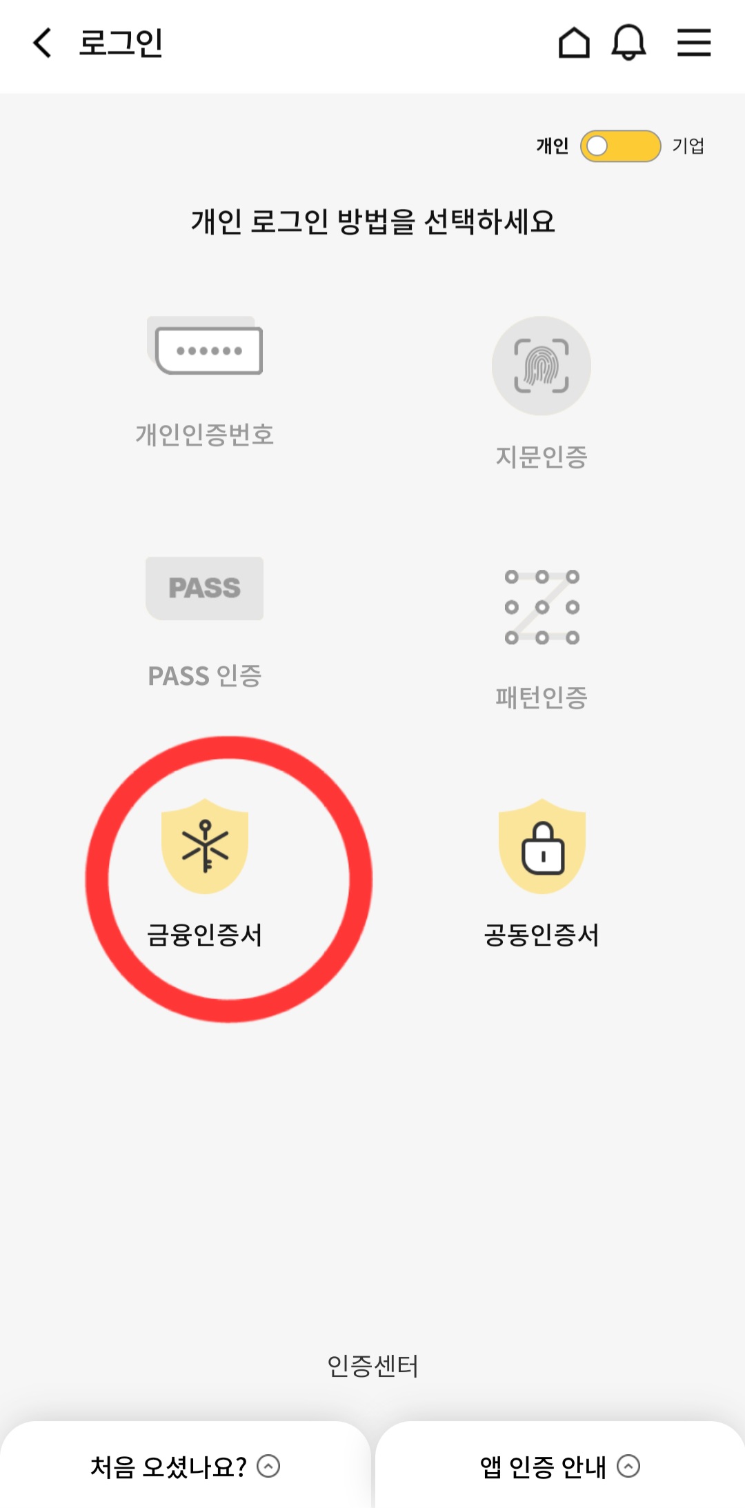 어플을 열어주신후 개인/기업 선택 -> 기존/신규 회원 선택을 해줍니다