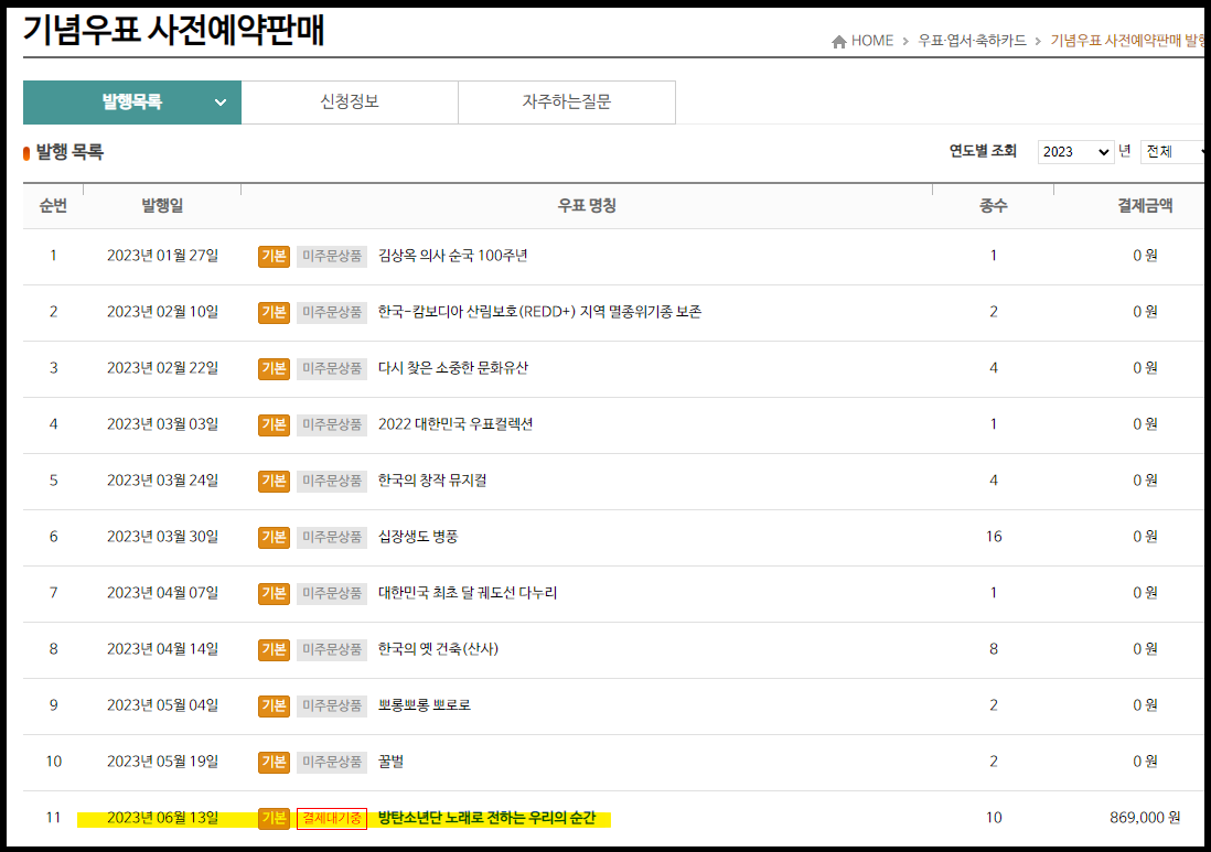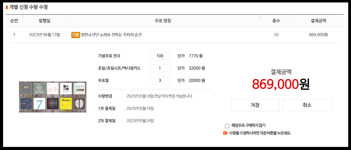 인터넷 우체국 > 기념우표 사전예약판매 > 결제정보 등록 > bts우표선택 > 구매수량 입력 > 신청정보 확인