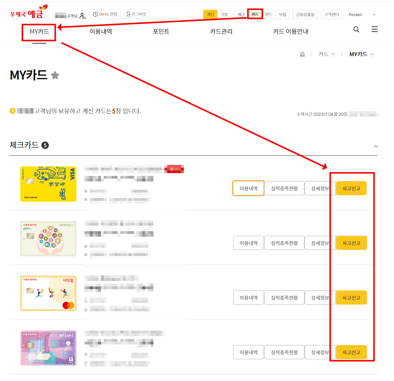 2. 카드 - 내 카드조회 - 분실카드선택 - 사고신고