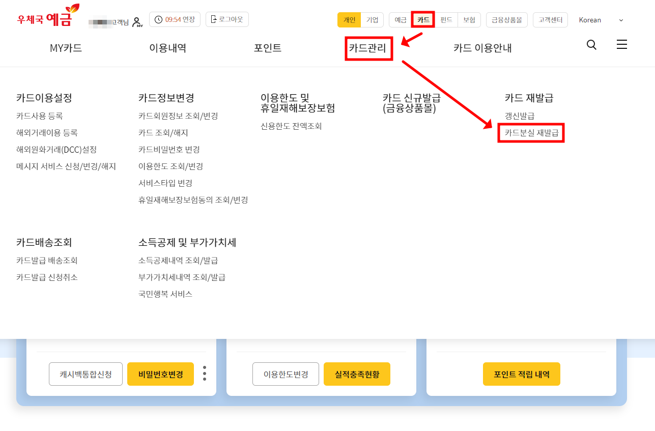 1. 카드 - 카드관리 - 카드분실 재발급