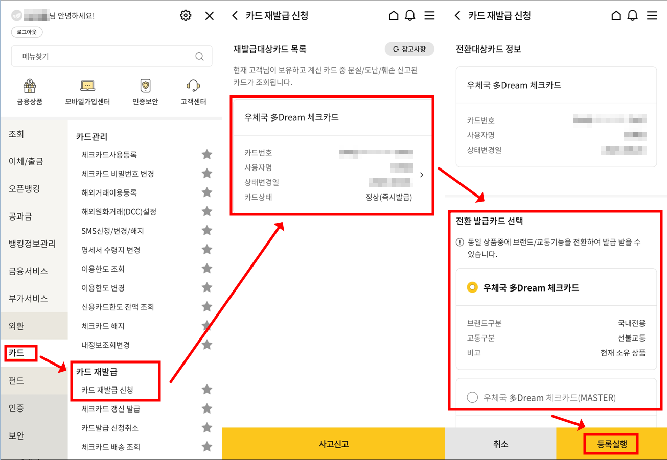 컴퓨터로 우체국 홈페이지에 접속하여 카드 분실신고 후 재발급 가능.