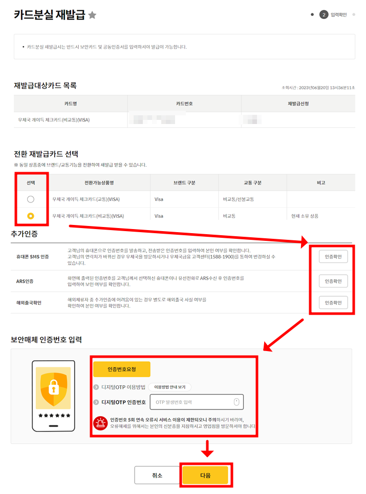 3. 재발급받을 카드 선택 후 인증