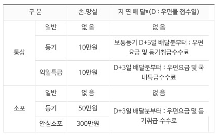 우편물이 파손, 분실, 지연배달되었을 경우 손해배상이 가능합니다. 손해배상 기준과 금액은 아래 이미지를 참고하시기 바랍니다. 택배는 등기소포입니다.