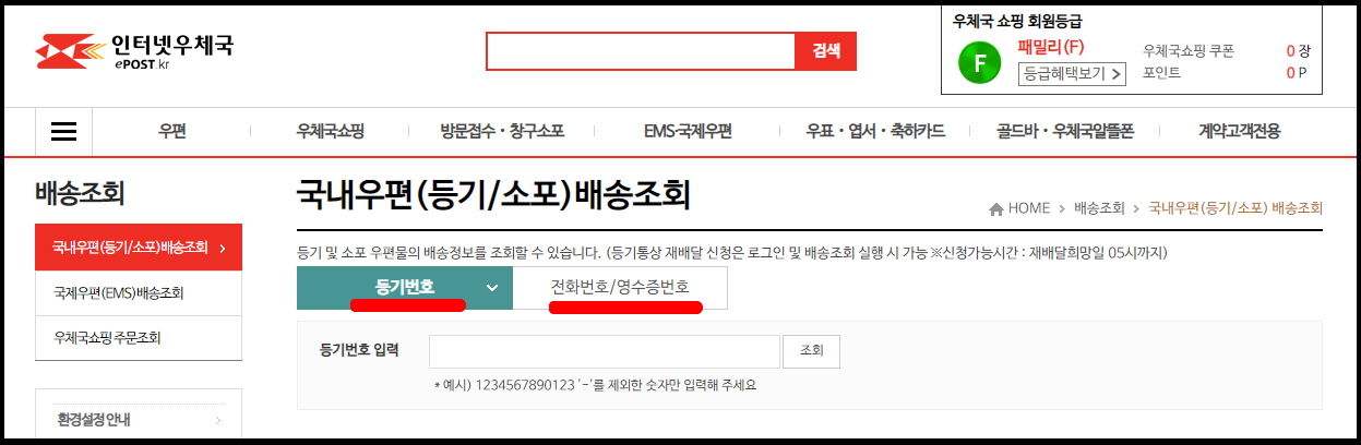 우체국 홈페이지에서는 등기번호와 전화번호/영수증 번호로 배송조회가 가능합니다.