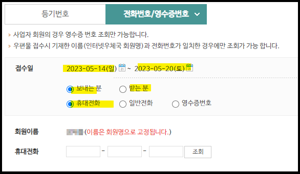 전화번호로 배송조회하는 방법은 우체국 홈페이지에 회원가입이 되어있는 경우에만 사용 가능한 방법으로 우체국을 종종 이용한다면 미리 회원가입 하시는것을 추천드립니다.