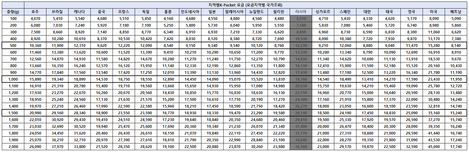 현재 전쟁중인 러시아를 제외한 19개 국가에 대하여, K-Packet 발송이 가능합니다. EMS와 마찬가지로 K-Packet또한 부피와 중량에 따라 요금이 달라집니다.