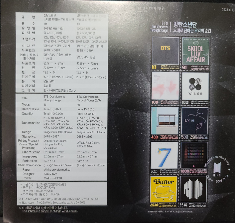 "방탄소년단 노래로전하는 우리의 순간 우표박물관 2023.6.13."이라는 일부인이 찍혀있습니다.