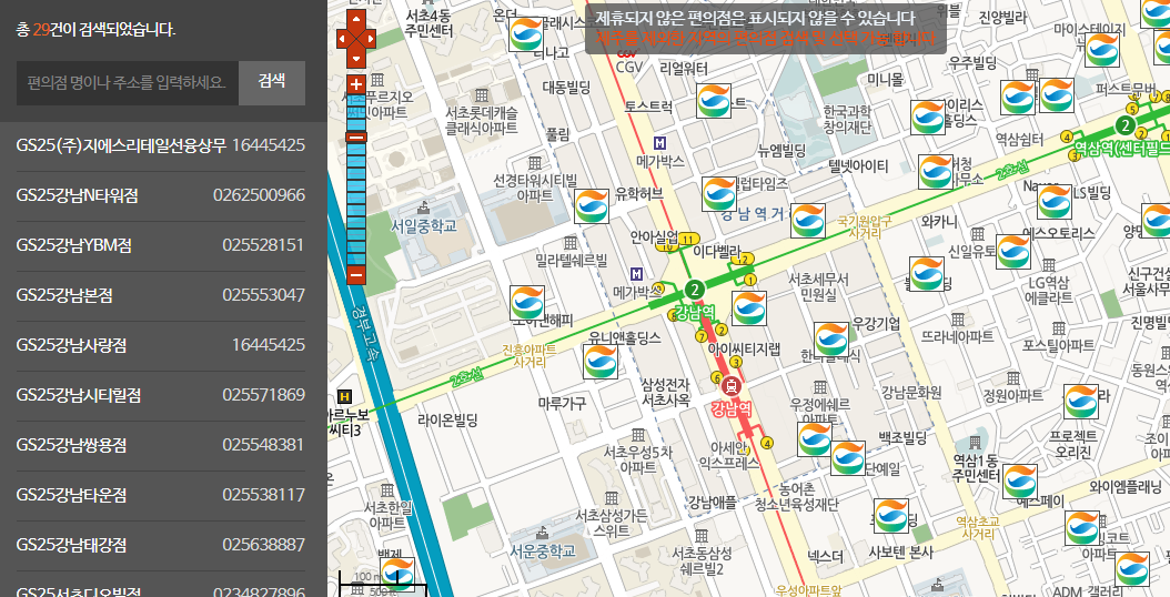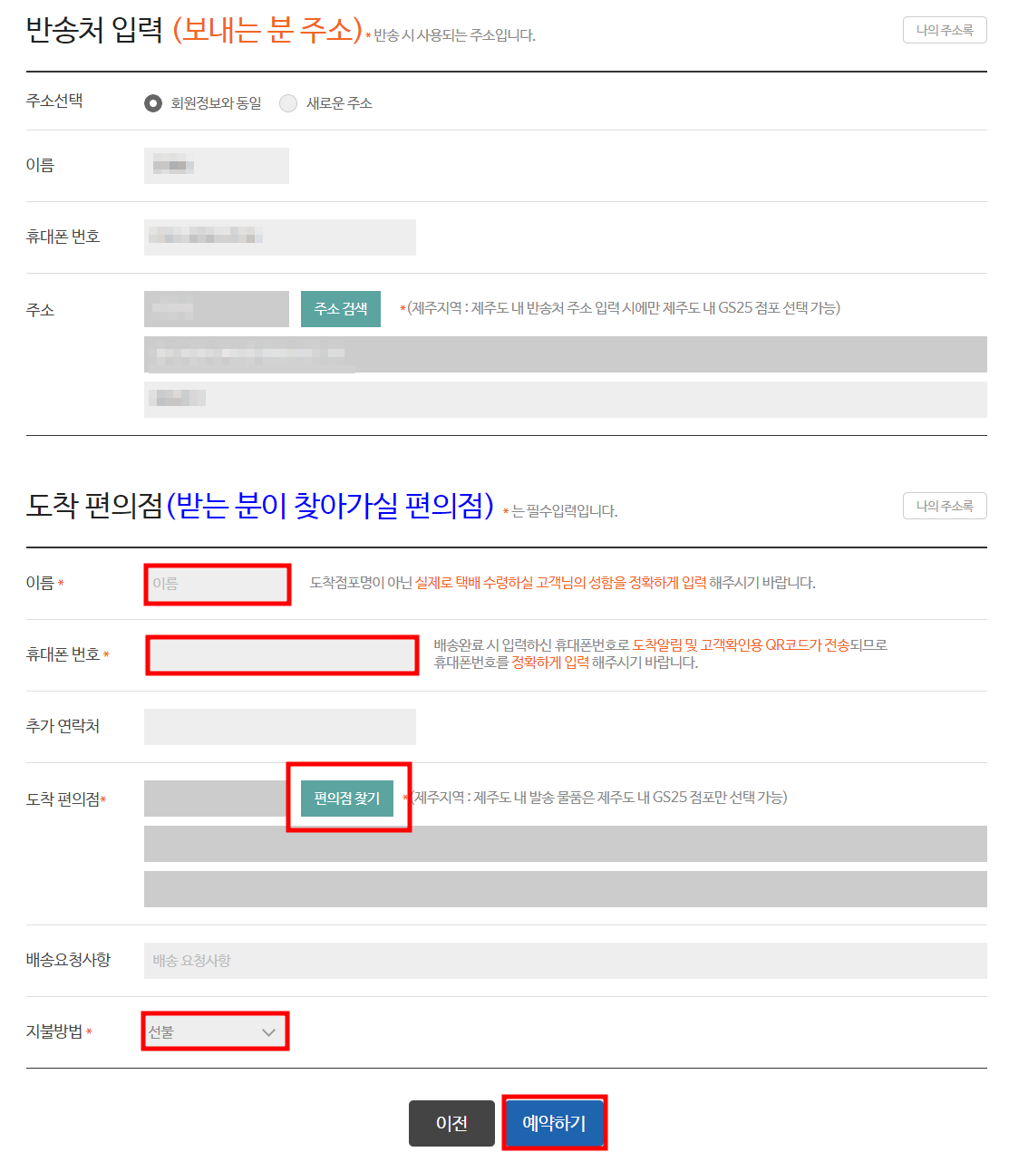 내용물을 선택 후 보내는분과 받는분 정보를 기입해주고, 배송할 편의점을 찾아 선택합니다.