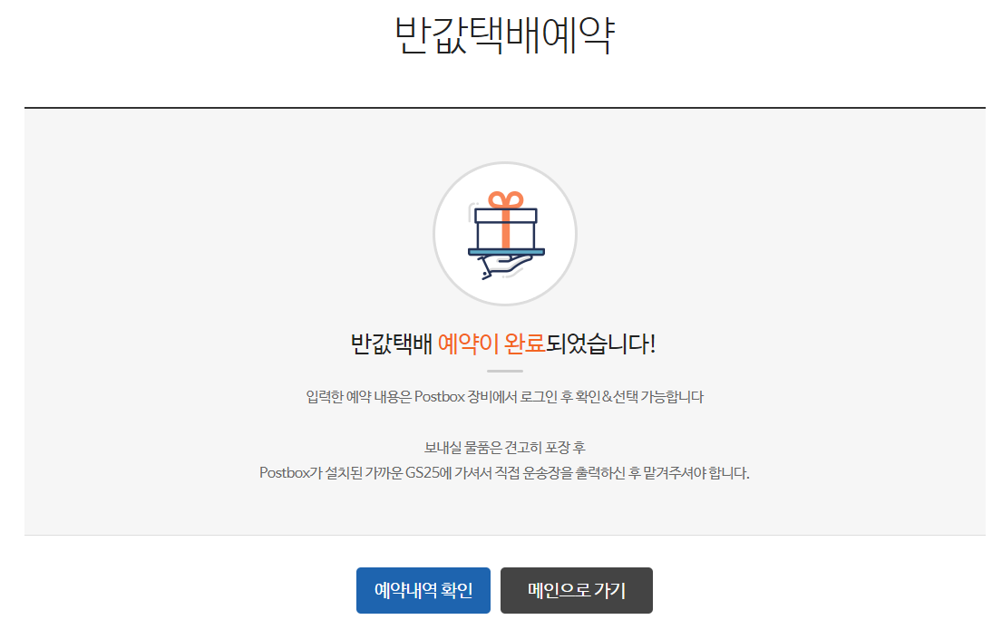 편의점선택이 끝나면 GS25 알뜰/반값 택배 접수가 완료되고, 접수예약이 끝나면 예약확인을 할 수있습니다.