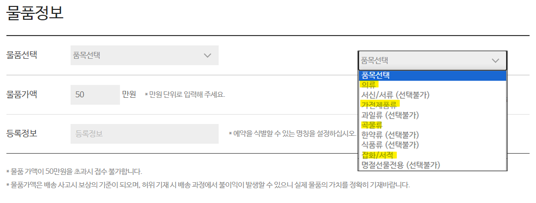 접수 할 품목의 종류를 선택하고, 물품가액(최대50만원), 택배명칭을 기재합니다.