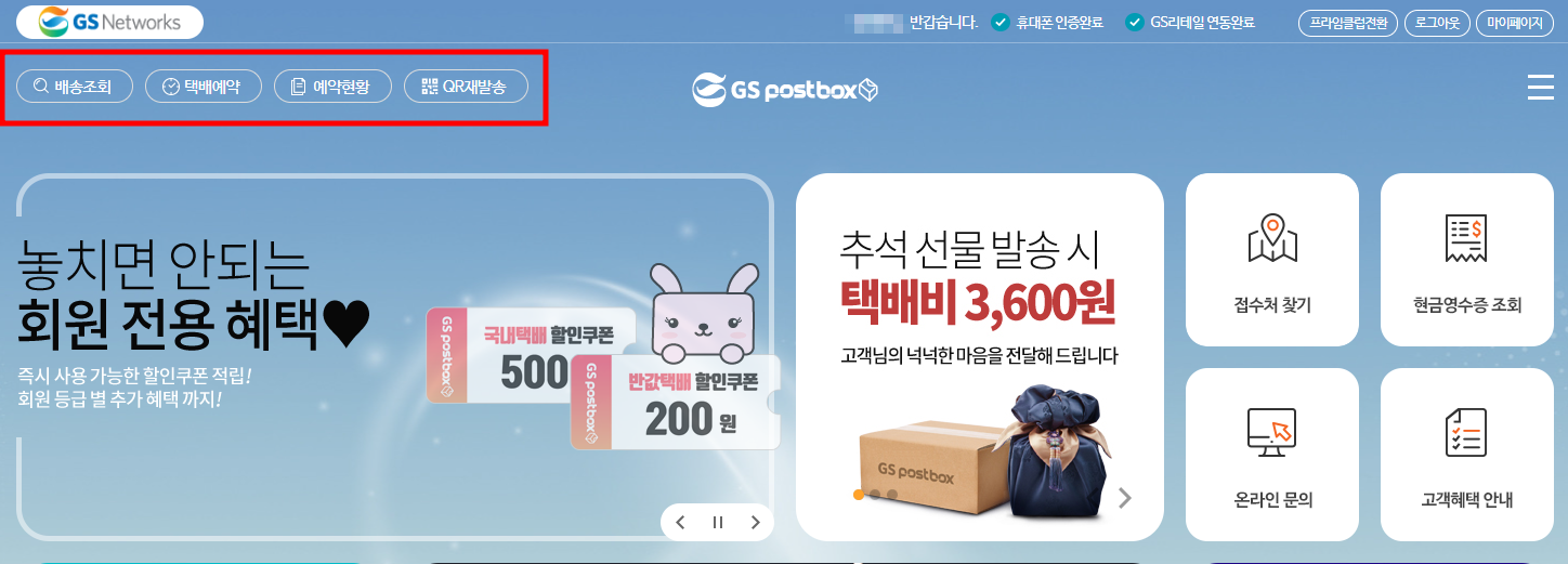 GS postbox 홈페이지로 접속하여 우측 상단에 회원가입/로그인을 합니다.