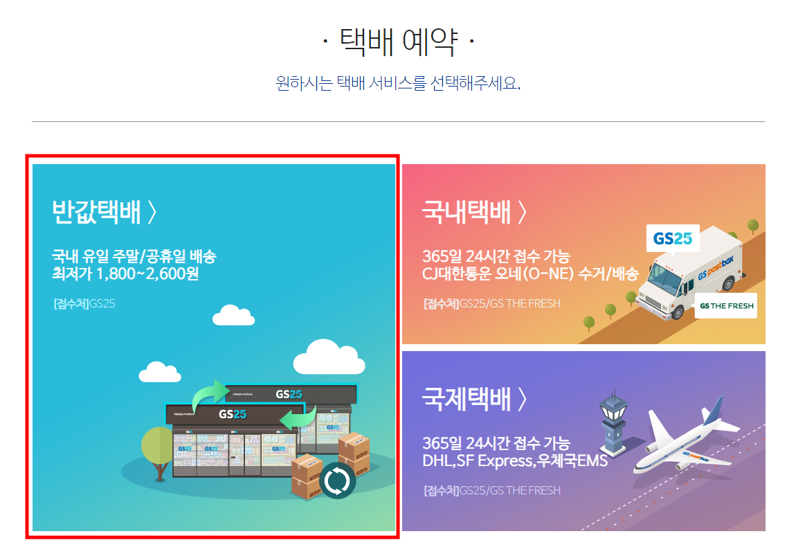 GS편의점에서는 반값택배, 국내택배, 국제택배 발송이 가능합니다. 반값택배를 선택합니다